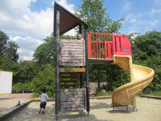 Die Rutsche geht im Kreis hinunter und an dem großen Klettergerüst gibt es Reifen zum Hochklettern und eine Stange zum Hinunterrutschen. Vom Brunnen aus gibt es Kanäle, in denen du ein Papierboot oder andere Dinge fahren lassen kannst. Du kannst hier auch prima Dämme bauen, um das Wasser umzuleiten.