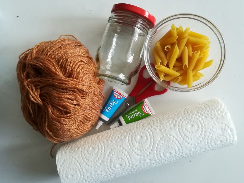 Als erstes legen wir uns die (nicht gekochten!) Nudeln, die Lebensmittelfarbe und das Glas zurecht. |