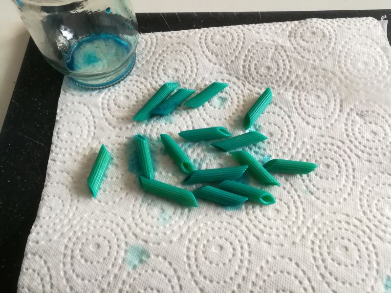 Sobald die erste Farbe der Nudeln fertig ist, können wir das Färben mit einer anderen Lebensmittelfarbe wiederholen, so dass unsere Nudeln viele verschiedene Farben haben. |