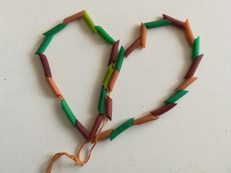 Wenn die Nudeln fertig getrocknet sind, kann man sie prima auf einen beliebig zugeschnittenen Faden auffädeln. Auf diese Weise entsteht eine Halskette. |