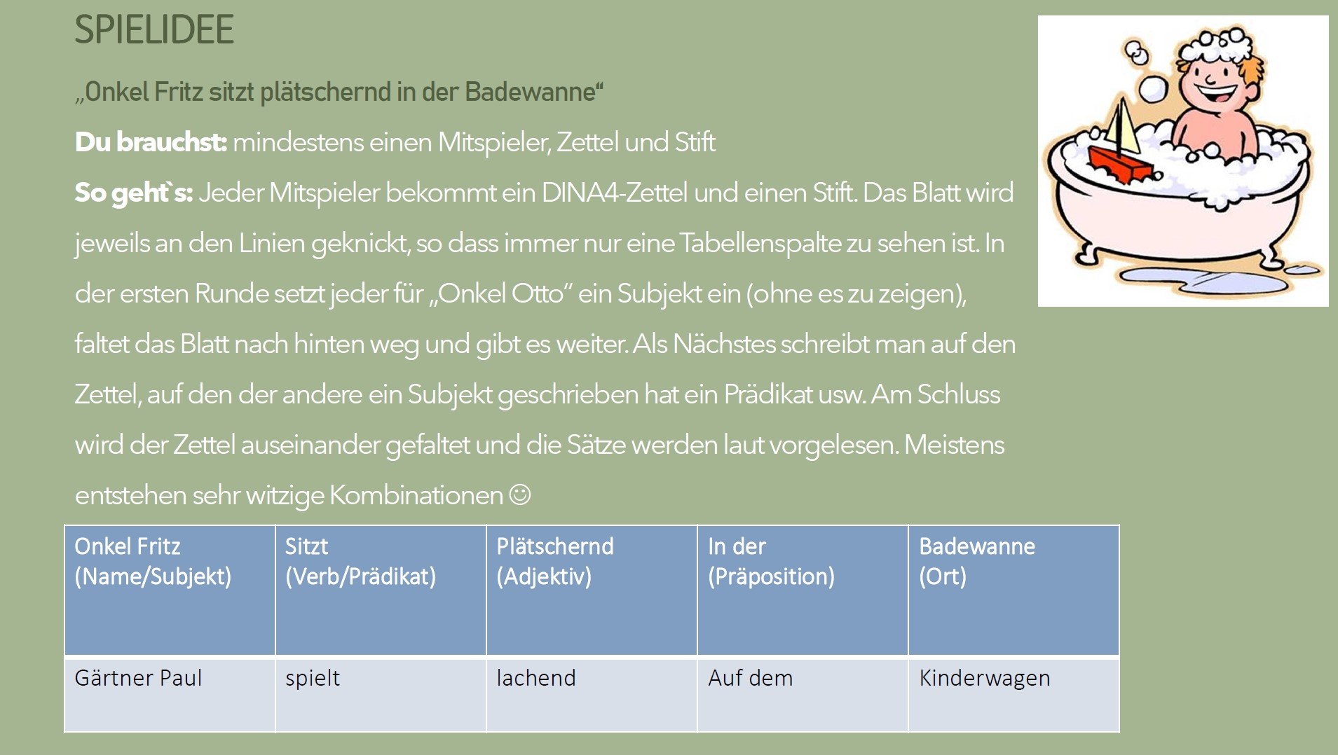 | „Onkel Fritz sitzt plätschernd in der Badewanne.“ – ein witziges Spiel mit Wörtern! |
