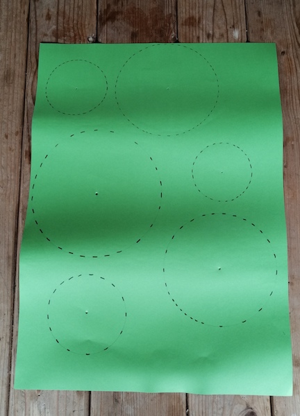 1. Schritt: Zeichne mit deinem Zirkel Kreise in verschiedenen Größen auf das Tonpapier. Durch jeden Kreis sollte am Ende ein Papierflieger passen! Steche anschließend mit einem spitzen Bleistift Löcher in die Mitte der Kreise, damit du sie leichter ausschneiden kannst. |