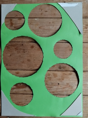 2. Schritt: Schneide die vorgezeichneten Kreise mit der Schere aus. Damit das Papier stabiler wird und sich nicht wellt, kannst du noch Dreiecke aus einem festeren Karton ausschneiden und an den Ecken des Tonpapiers befestigen. |
