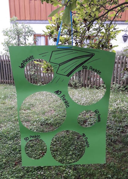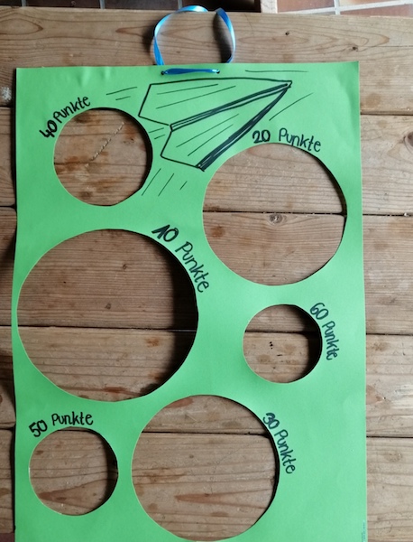 Erinnerst du dich noch an die zwei Papierflieger-Modelle Düsenjäger und Blauer Pfeil, die wir im Bastel-Tipp vorgestellt haben? Hier ist die passende Spielidee dazu: Eine Zielscheibe zum Papierflieger Durchwerfen.