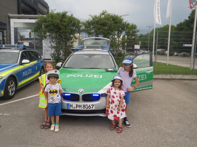 Antonia (6), Laura (11), Maxi (6), Moritz (6) und Valentina (3) haben auf ihrer Forschertour zur Polizei viele spannende Dinge herausgefunden. Es gibt zum Beispiel nicht nur Polizeiautos, sondern auch Hunde und Pferde, die bei der Polizei zum Einsatz kommen. Die Polizisten der Polizeiinspektion haben bis zu 100 Einsätze am Tag. Die Forscher und Forscherinnen wurden von zwei sehr netten Kinder- und Jugendbeauftragten herumgeführt, die ihnen alle Fragen beantworteten. Sie durften sich die Arrestzellen ansehen, was sie sehr spannend fanden. Das Highlight der Tour war die Besichtigung des Polizeiautos. Maxi (6) durfte sogar die Sirene anmachen.