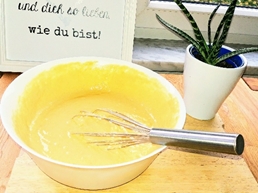 Alle weiteren Zutaten (Eier, Apfelmus, Milch, Salz und Vanillezucker) dazugeben und zu einem geschmeidigen Teig verrühren.