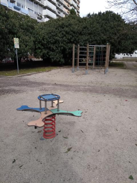 Hier findest du einen kleinen Spielplatz mit einem Klettergerüst und einem Wipptier.