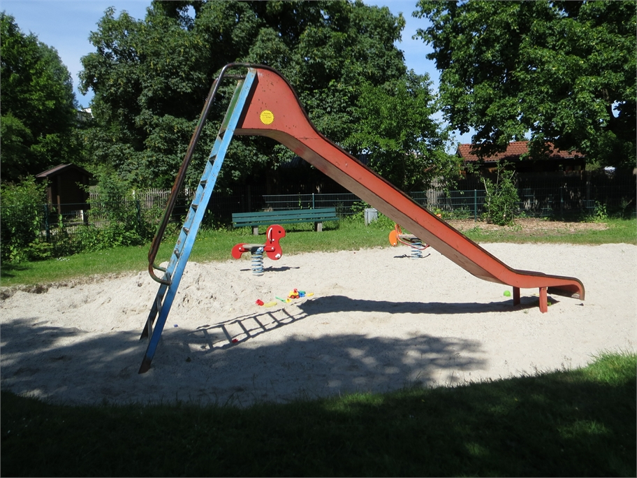 An heißen Sommertagen wird die Rutsche sehr heiß, weil sie den ganzen Tag in der Sonne steht. Außerdem gibt es auf dem Spielplatz noch eine Tischtennisplatte und eine große Wiese.