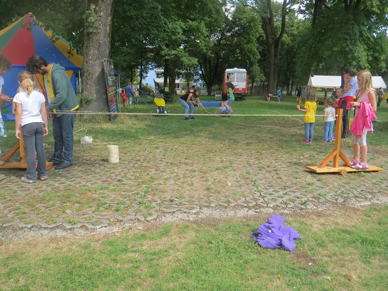 Hier kannst du dir ein Seil selber drehen. Zum Beispiel ein Springseil. Das kannst du danach mitnehmen und ganz viele Sprünge üben und wenn du Lust hast im Zirkus auftreten. Mit dem selbst gemachten Seil!
