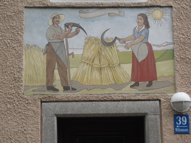 Sgraffiti ist der Name für eine alte Technik, mit der man Bilder in den Putz der Wand „kratzen“ kann. Vor 500 Jahren haben die Menschen schon so ihre Hauswände verschönert! Die Häuser in der Triesterstraße und in der Wilramstraße tragen auch solche Sgraffiti an den Wänden.