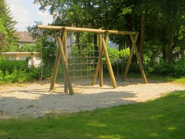Auf dem Spielplatz am Pfrontener Platz gibt es Spielmöglichkeiten für kleine und große Kinder. Es gibt ein kleines Kletternetzgerüst und ein Rutsche in einer Sandgrube. Auf derselben Wiese steht ein Stück weiter noch ein Kletternetz mit einer Schaukel. Wenn du gerne Tischtennis spielst, kannst du das hier an zwei Tischtennisplatten machen.