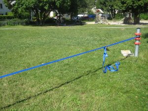 Etwas ganz Besonderes hat die Spielplatzpatin Nicole für die Kinder organisiert. Neben dem Bolzplatz befinden sich zwei feste Pfosten, an denen eine Slackline gespannt werden kann. Ronja (7) und Sophie (10), die zum ersten Mal ausprobiert haben auf dem Gurtband zu balancieren, sind ganz begeistert davon.