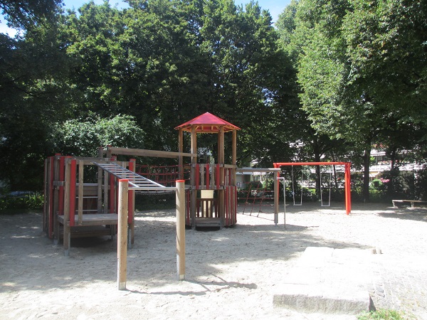 Die Spielgeräte auf dem Spielplatz sehen sehr neu aus. Das Holz und der rote Anstrich sind in einem sehr guten Zustand und es sieht kaum abgenutzt aus. Du findest hier zwei Schaukeln und einige Spielgeräte zum Klettern und Hangeln. Neben dem Sandplatz findest du eine große Wiese, auf der mehrere Steine zum Sitzen und zwei Drehteller aufgestellt sind.