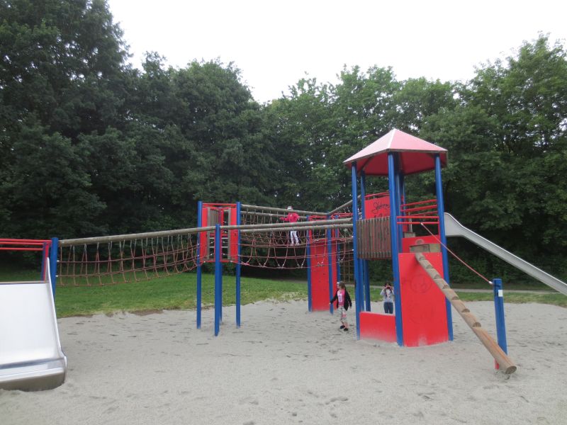 Der Spielplatz an der Herterich Straße überzeugte die Spielplatzforscherinnen Tiffi (9), Hanna (9), Sara (8), Lana (9), Monika (9) und Tuana (9) besonders aufgrund der großen Wiese, die zum Toben, Turnen und Picknick machen ein lädt. Außerdem findest du hier zwei tolle Rodelhügel zum Schlittenfahren im Winter. Es gibt ein kleineres Spielgerät mit Kletternetzen, Feuerwehrstange und Tellerschaukeln und neben diesem Spielgerät kannst du auf einem tollen, ausladenden Kletterbaum klettern. Weiter hinten auf der Wiese ist noch ein größeres Spielgerät aufgebaut, auf dem du auch klettern kannst. Aber auch rutschen und balancieren kannst du hier gut, finden die Spielplatz Forscherinnen. Toll finden die Mädchen auch die beiden Schaukeln, weil du hier besonders hoch schaukeln kannst.