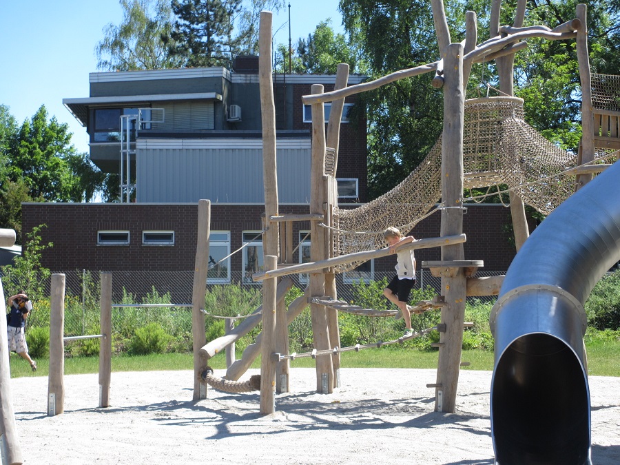 Alle Kinder aus dem Stadtteil sind davon begeistert. Felix (6) und Marie (3) treffen sich hier häufig mit anderen Kindern. Johann (8) gefällt besonders die lange Röhrenrutsche, aber auch das riesige Klettergerüst mit dicken Seilen zum Drüberlaufen, Stangen zum Dranhängen und einem „Seilkäfig“ zum Durchklettern. Auf dem Spielplatz findest du auch noch eine kleine Netzschaukel und für Kleinkinder gibt es ein Spielhäuschen und einen Blumentisch. Etwas abseits steht ein kleines Karussell und zwei blaue Würfel.