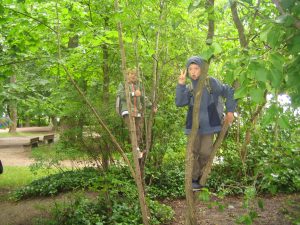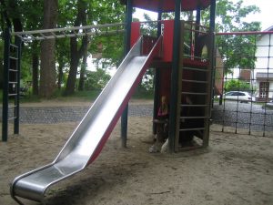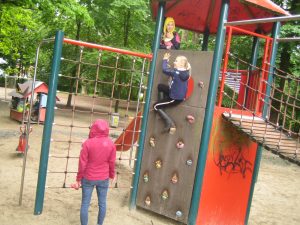 Elisabeth (8) findet an diesem Spielplatz besonders die verschiedenen Klettermöglichkeiten toll. Es gibt eine Kletterwand, ein Kletternetz, Stangen zum Hangeln und eine Rutschstange. Die Wackelbrücke ist auch besonders spannend und runter kommt man über eine Rutsche. Für kleinere Kinder gibt es auch ein Schaukelpferd. Die Spielehütte bietet einen gemütlichen Unterschlupf- so lässt sich auch Regenwetter aushalten! Neben dem Spielplatz ist eine Wiese und der Platz ist von Bäumen und Büschen umgeben in denen man sich verstecken kann und sich auf geheimen Pfaden bewegen kann. Auf einigen Bäumen kann man gut klettern, das haben uns Julius (9), Titus (9), Max (9) und Mihael (9) gezeigt! Yevehniia findet es blöd dass in den Büschen immer wieder Müll herum liegt. Das liegt wohl daran, dass es zu wenig Mülltonnen gibt, meint sie.