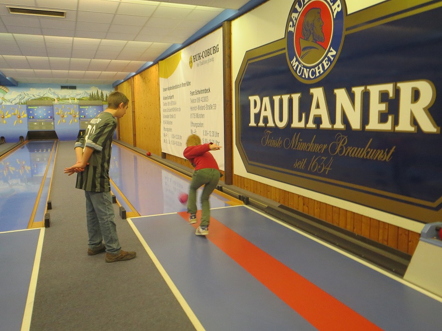 Die Spielforscher Valentin (10), Sebastian (12), Leon (12), Andreas (14) und Maxi (14) der Landesschule für Körperbehinderte erfuhren von der ehemaligen „Kegelkönigin“, die diesem Sport schon seit 40 Jahren nachgeht, dass das Kegelzentrum aus zwei Kegelbahnanlagen mit insgesamt 18 Bahnen besteht. Die Besucher kommen entweder zum Spaß und Vergnügen (Privatkegeln, Diskokegeln) oder zur sportlichen Freizeitbetätigung, wie beispielsweise verschiedene Vereine, die dort Sportkegeln. In der Kegelanlage des Münchner Kegelvereins e.V. trainiert auch die Kegelabteilung des FC Bayern München, die schon seit 1983 besteht. Nach dem Interview dürften die Forscher selbst auch eine Kugel in die Hand nehmen und das Kegeln ausprobieren, was ihnen große Freude bereitete.