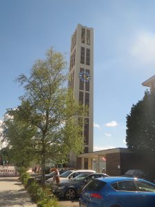 Den Kirchturm in der Heckenstallerstraße 104 kannst du schon von weitem gut sehen. Er ragt ganz schmal weit hinauf.