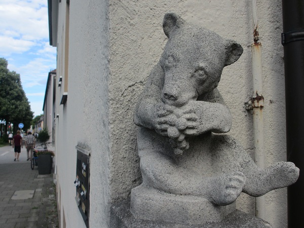 Vor der Hausnummer 103 sitzt ein Bär auf einem Steinsockel. Es sieht so aus, alsob er gerade Bären oder Weintrauben in den Tatzen hält und isst.