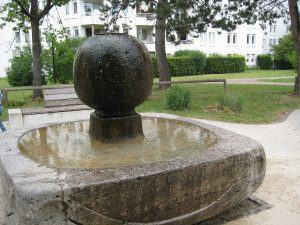 Im Innenhof des Gottfried-Böhm-Rings 4-24 findest du beim Spielplatz einen quadratischen Brunnen mit einer Kugel in der Mitte.