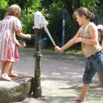 Im Sommer ist die Wasserpumpe am beliebtesten. Auf der Wiese ist ein Treffpunkt zum Bolzen. Eine Rutsche sieht aus wie ein bunter Vogel. Im Sand stehen Spielhäuschen und eine Hängematte. Kinder und Jugendlichetreffen sich unter der Überdachung, dort steht auch