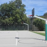 Hier gibt es einen Basketballkorb und eine asphaltierte Fläche zum Spielen.