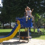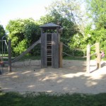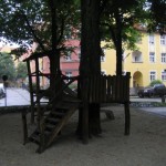 Hier steht ein großes Pyramiden-Klettergerüst. Dies ist das Beste am ganzen Spielplatz, findet Selin. Das Tolle daran ist, dass man so weit nach oben klettern kann und einen ungewöhnlichen Ausblick über die ganze Theresienwiese hat. Springhasen können auf der Hängematte…