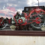 Im Schaufenster der Pizzeria sind zwei rote Motorräder.