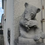 Vor der Hausnummer 103 sitzt ein Bär auf einem Steinsockel. Es sieht so aus, alsob er gerade Bären oder Weintrauben in den Tatzen hält und isst.