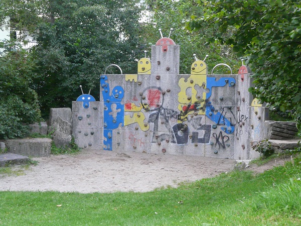 Hier sind gleich mehrere Spielplätze beieinander. In der Hügellandschaft steht eine Tarzanbahn, Reifenschaukeln und eine Kletterwand. Daneben gibt es einen eingezäunten Kleinkinderspielplatz mit großem Klettergrüst. Auch eine Tischtennisplatte, ein Basketballkorb und neue Dreh- und Wippgeräte findest du dort. Am besten aber sind die natürlichen Tunnel in den Sträuchern rundherum, findet Nadja (9 Jahre).