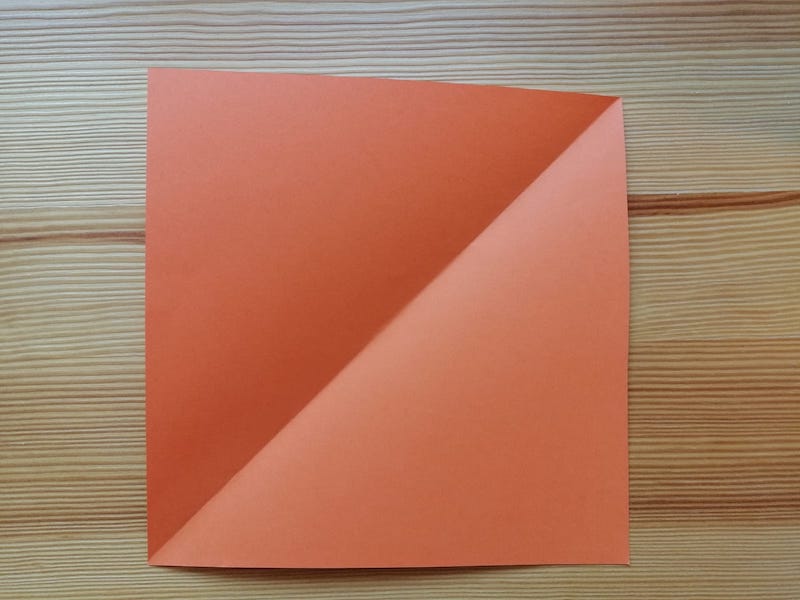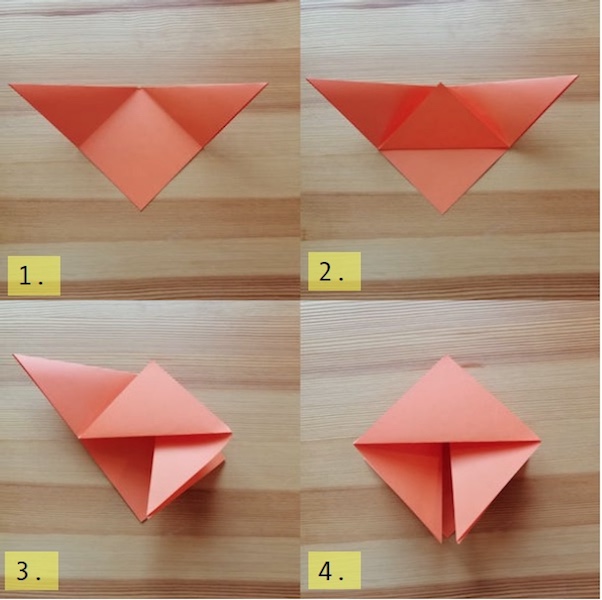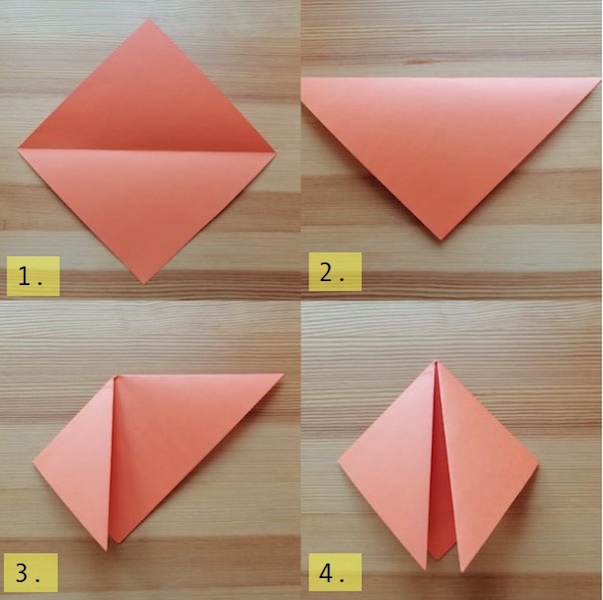 2. Schritt Falte dein Papier diagonal zu einem Dreieck. Durch das Falten im ersten Schritt hat du den richtigen Knick ja schon im Papier (Bilder 1 und 2). Falte dann die linke und rechte Ecke zur unteren Mitte (Bilder 3 und 4). |