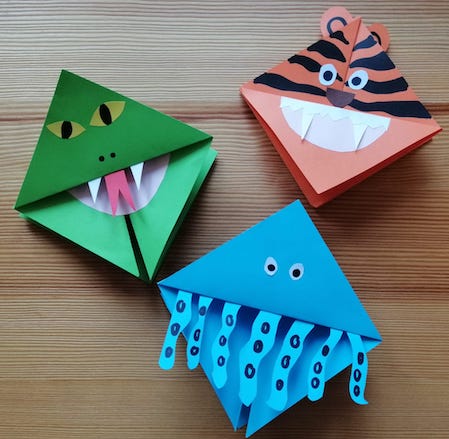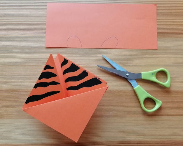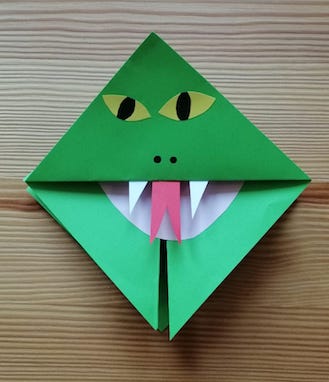 Die Schlange faltest du genauso wie den Tiger. Befolge einfach die Schritte 1-3. Zum Verzieren brauchst du zwei gelbe Schlitzaugen mit schwarzen Pupillen, zwei spitze Zähne und eine lange Zunge. Genau wie der Tiger hat auch sie ein rosa Maul. |