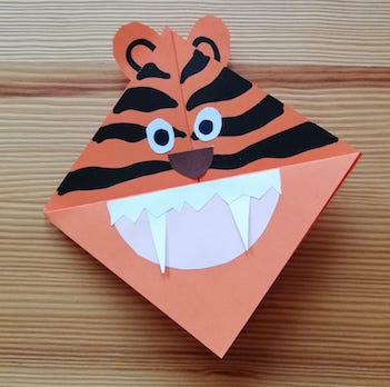 Für ein Tiger-Lesezeichen malst du einfach mit einem schwarzen Filzstift Streifen aufs Papier. Aus dem am Anfang übrig gebliebenen Streifen kannst du Ohren ausschneiden. Dann schneidest du Augen, Nase und ein rosafarbenes Maul mit Zähnen zurecht. |