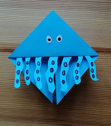 Schneide für den Tintenfisch blaue Tentakel aus und bemale sie mit schwarzen Kreisen. Außerdem hat er zwei kleine Augen, kreisrund ausgeschnitten aus weißem Papier. Die Pupillen sind mit Filzstift aufgemalt. |