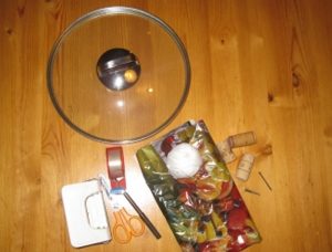 Leg deine Kreis-Schablone (den Teller oder Topfdeckel) auf die Plastiktüte. Mit dem Kugelschreiber zeichnest du einen Kreis auf die Plastiktüte.