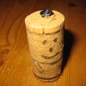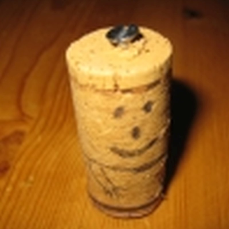 Die Schraube drehst du in den Korken hinein, bis nur noch der Kopf der Schraube zu sehen ist. Male dem Korken ein Gesicht, vielleicht auch Arme und Beine, er soll sich ja in deinen Luft-Akrobaten verwandeln!