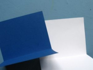 Nimm 2 gleich große Papiere: 1 weiß, 1 bunt. Falte sie in der Mitte.