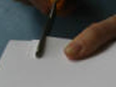 In das weiße gefaltete Papier machst du zwei Schnitte nebeneinander in einem Abstand von 1 bis 2 cm.