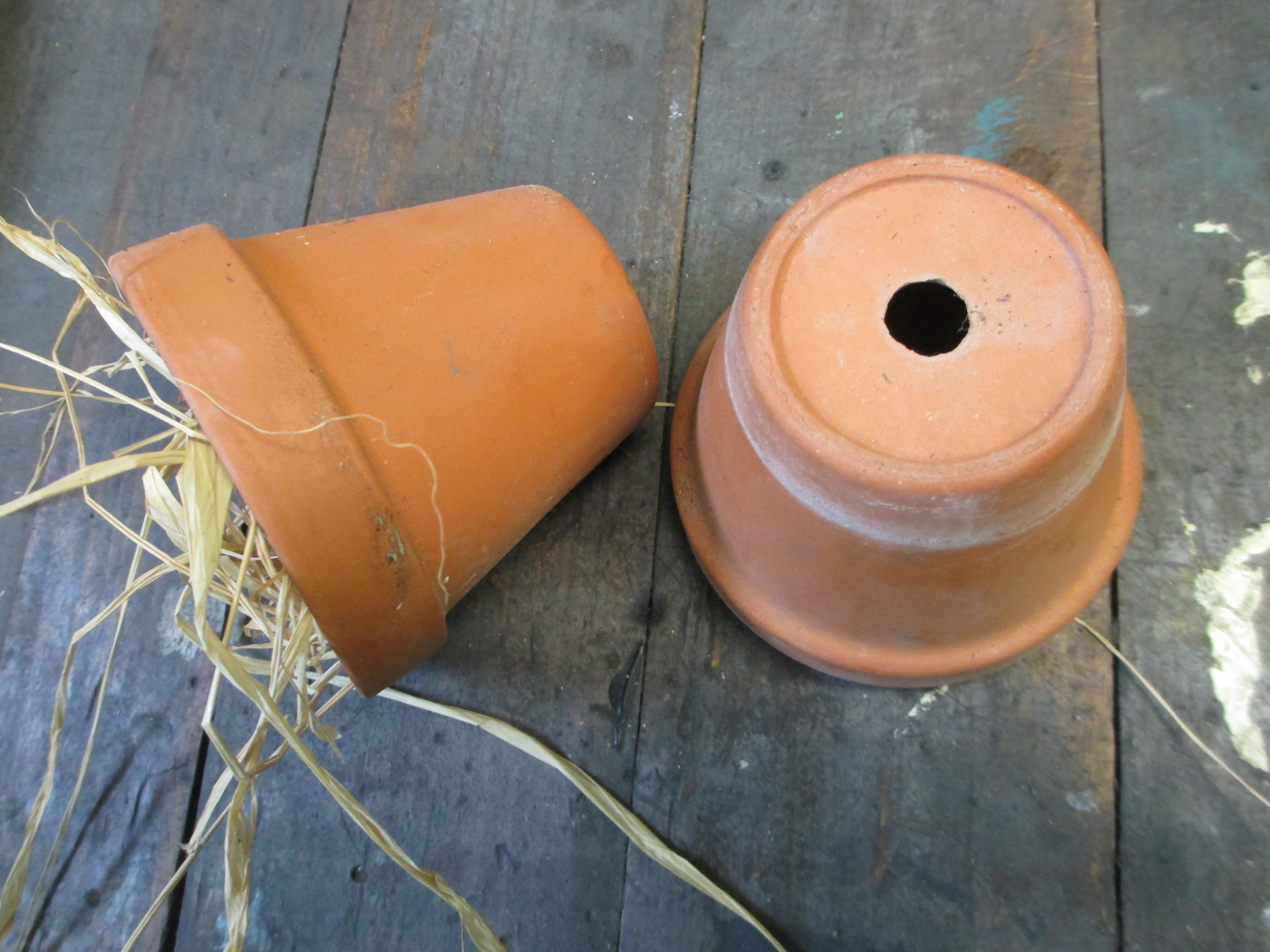 Die Blumentöpfe mit Bast oder Stroh füllen. |