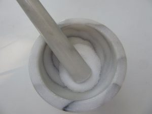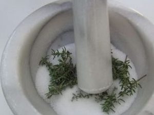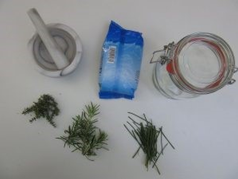 Salz im Mörser reiben, dabei nach und nach die Kräuter dazu schütten. |