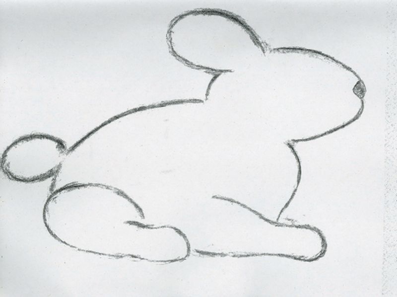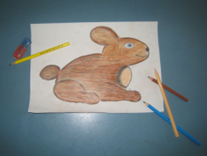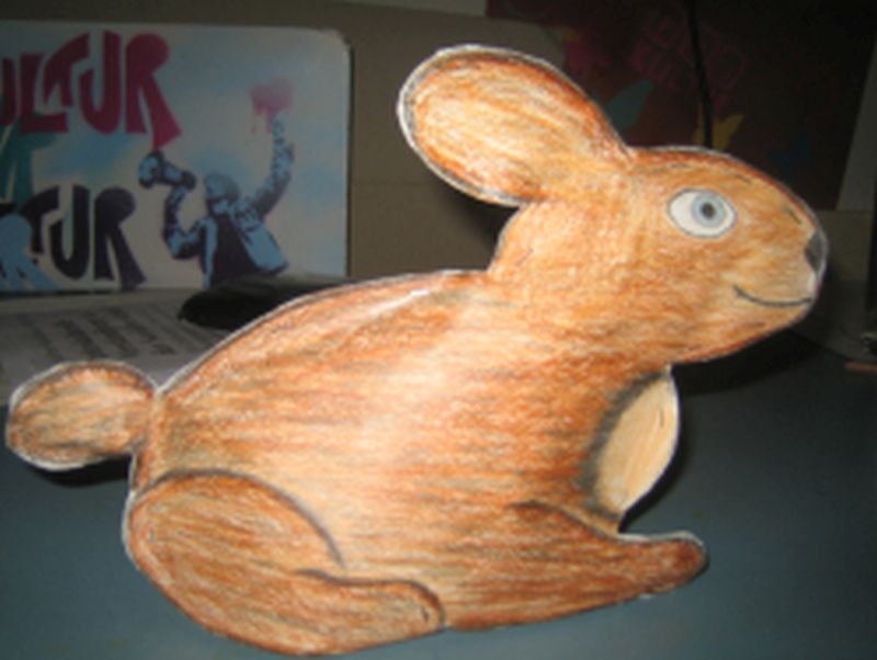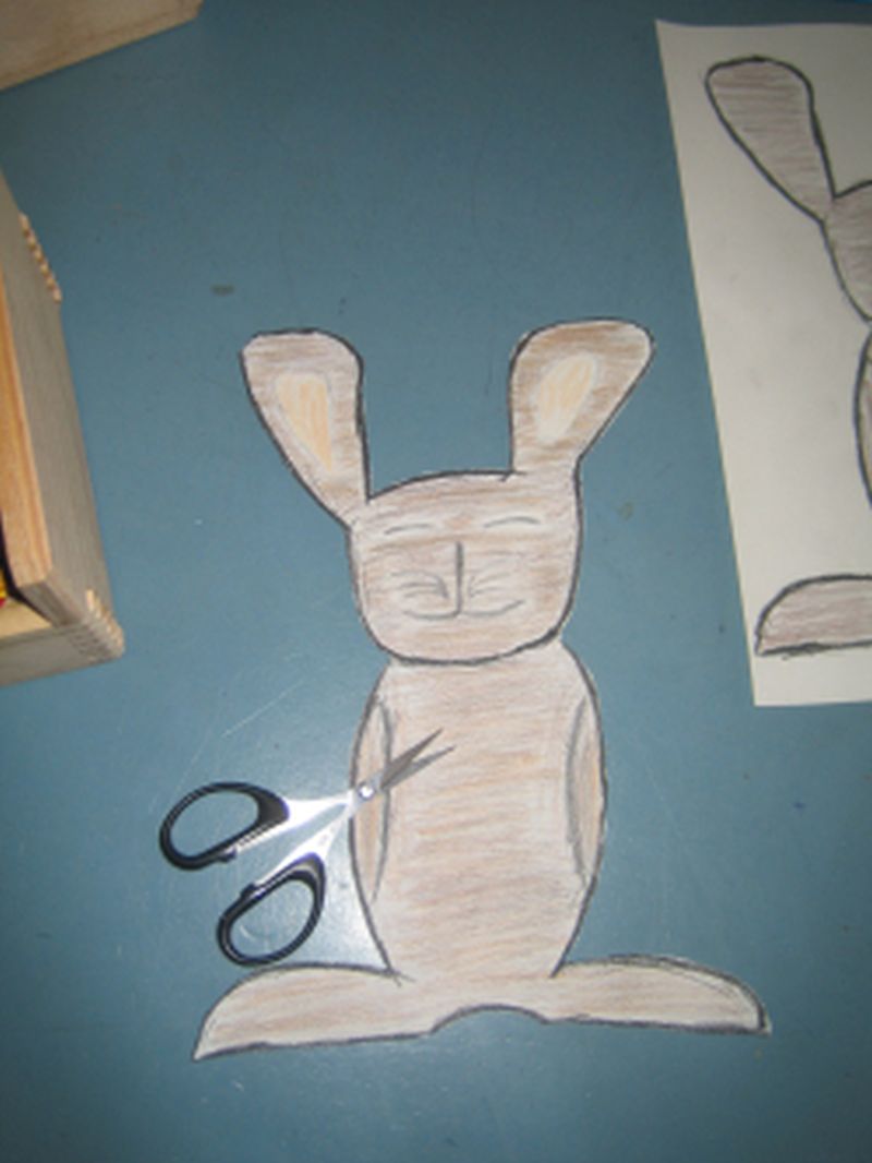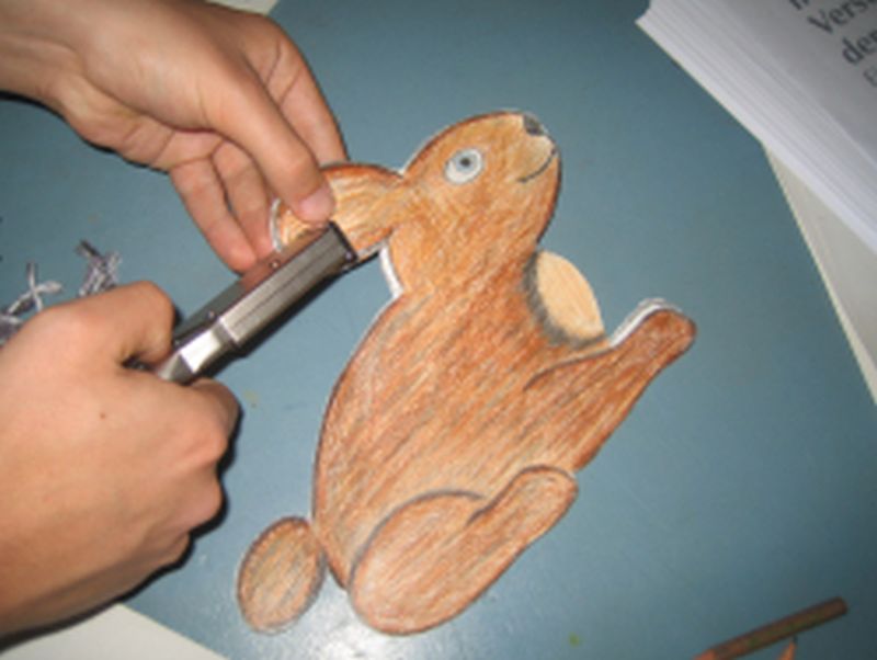 Die Vorder- und Rückseite malst du bunt an und dann schneidest du den Hasen aus. |