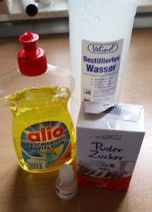 100g Puderzucker langsam in einen dreiviertel Liter – das sind 750 Mililiter – destiliertes Wasser einrühren.