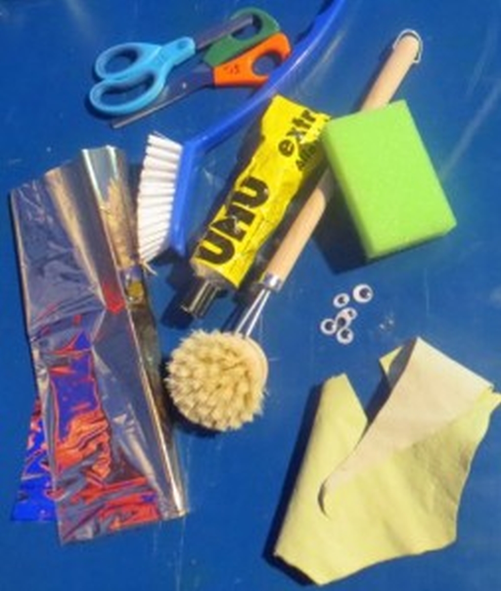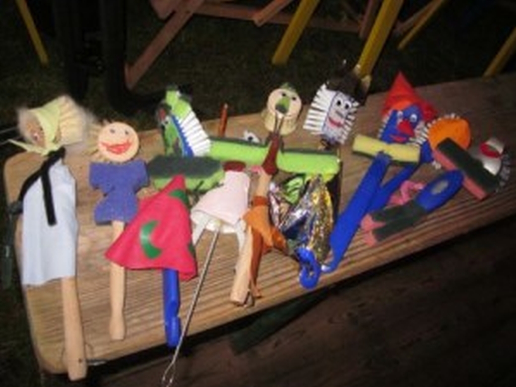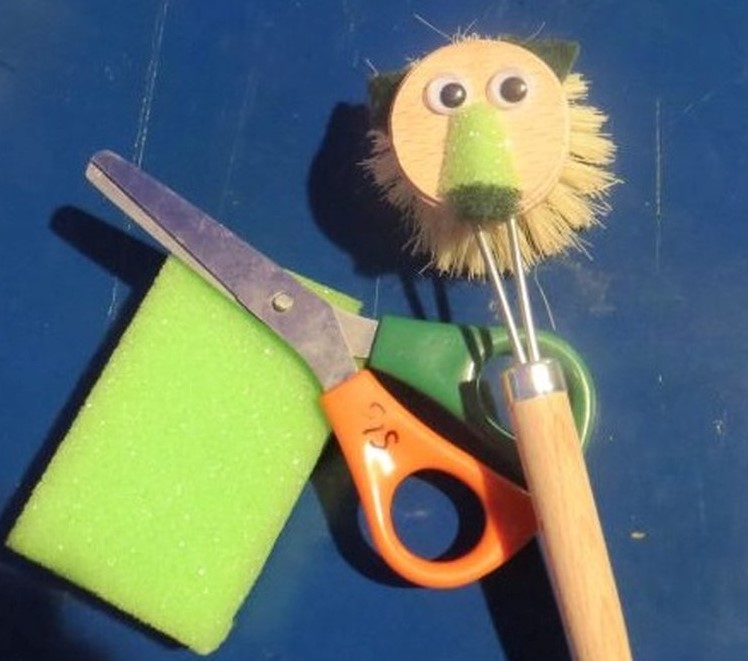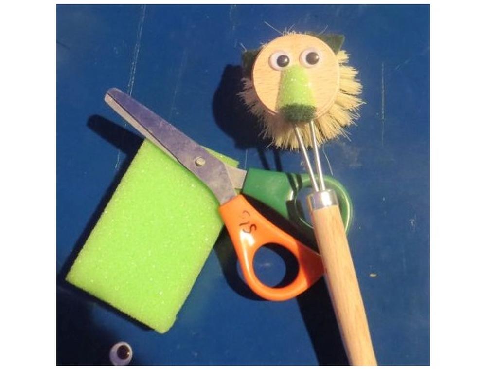 Hier kannst du lernen, wie man aus Spülbürsten ein richtiges Puppentheater-Ensemble zusammenstellen kann.