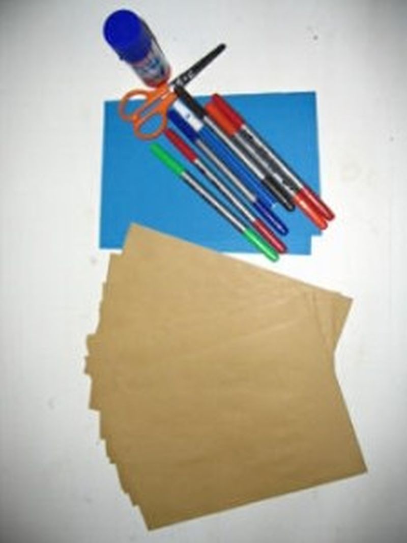 etwas buntes Papier und zum Beispiel Prospekt- und Zeitungsauschnitte zum Bekleben der Taschen