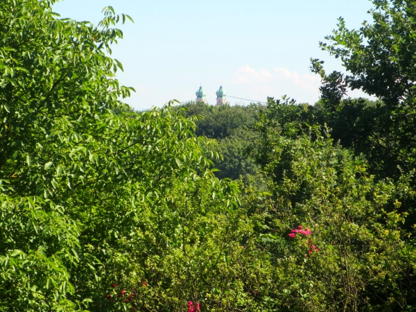 Von oben siehst du vor allem viele Bäume, aber in der Ferne kannst du auch Gebäude sehen. Ob du herausfindest, zu welchem Gebäude die zwei Türme im Titelbild gehören?
