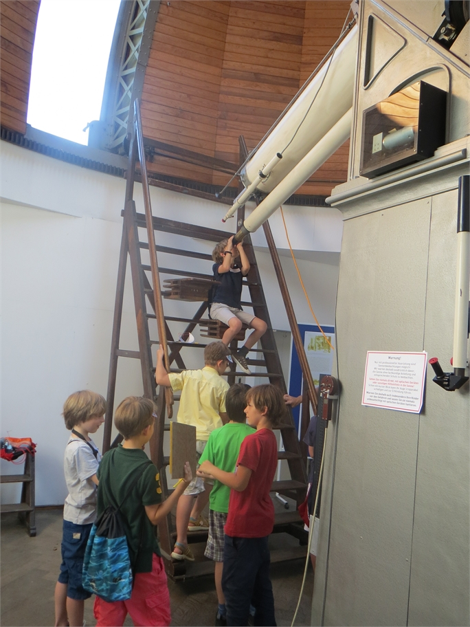 Zur Sternwarte gehört ein sehr altes Teleskop, mit dem man schon vor über 200 Jahren Sterne und Planeten beobachten konnte. Das Forscherteam der Klasse 3b bekam am Vormittag zwar keine Sterne vor die Linse, aber dafür konnten sie die Blätter an den Bäumen vergrößerst erkennen. Die große Kuppel unter der sich das Teleskop befindet kann man automatisch öffnen und auf einen kleinen Hocker auf einer fahrbaren Leiter kann man sich hinsetzen und von dort gemütlich beobachten.