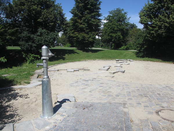 Wenn du an den Häusern der Hansastraße 84 vorbei gehst, kommst du zu einem großen Sandkasten mit einer Wasserpumpe. Die Pumpe hat leider keinen Hebel. Das finden unsere Forscher sehr schade.