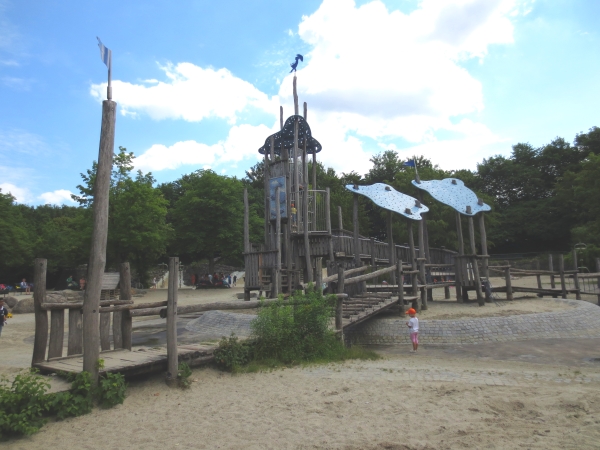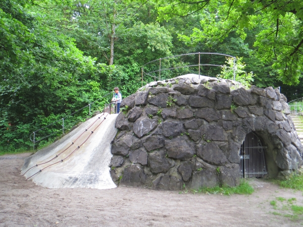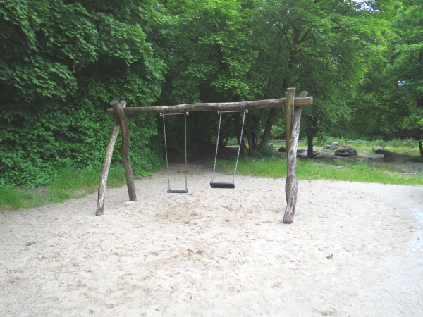 Eine lange Rutsche führt vom Klettergerüst wieder auf die andere Seite. Zudem gibt es auf dem Spielplatz überall Möglichkeiten zum Klettern und viele Plätze und Sitzmöglichkeiten zum verweilen. Außerdem findest du dort zwei Schaukeln, eine kleine Rutsche, Wippen und ein Häuschen.