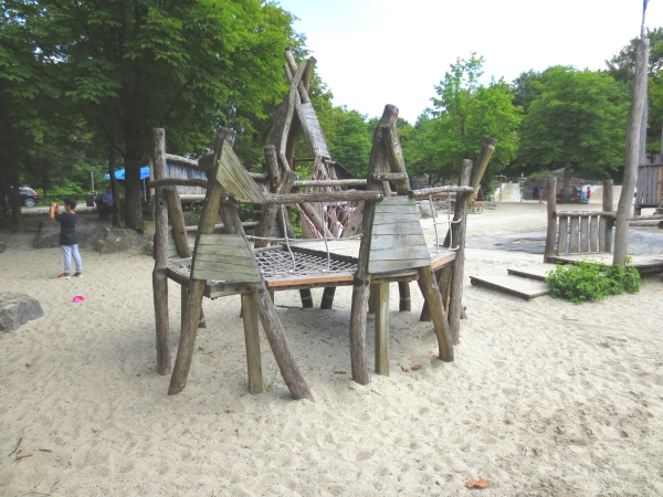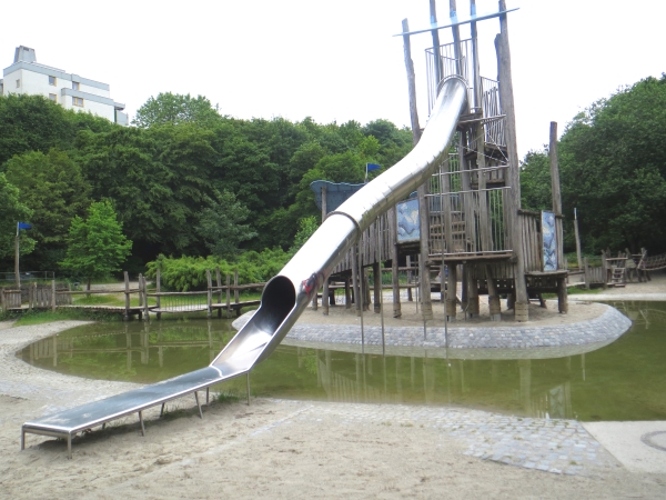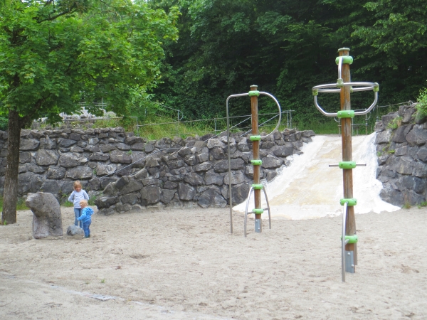 Wasserlauf am WasserspielplatzAm Spannendsten fanden die Jungs den Bachlauf, den sie bis zur Quelle verfolgten. Auf dem Spielplatz findest du zudem ein großes Klettergerüst in der Mitte des Platzes, das von einem Wassergraben umfasst ist. Auf das Klettergerüst kommst du entweder über verschiedene Brücke oder du musst durch das kühle, erfrischende Wasser waten.