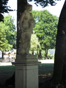 Unter riesigen Buchen hat Johann (8) eine Frauenskulptur gefunden. Er findet, dass es so aussieht, als würde die Frau mit einem Fuß auf einem Fußball stehen.